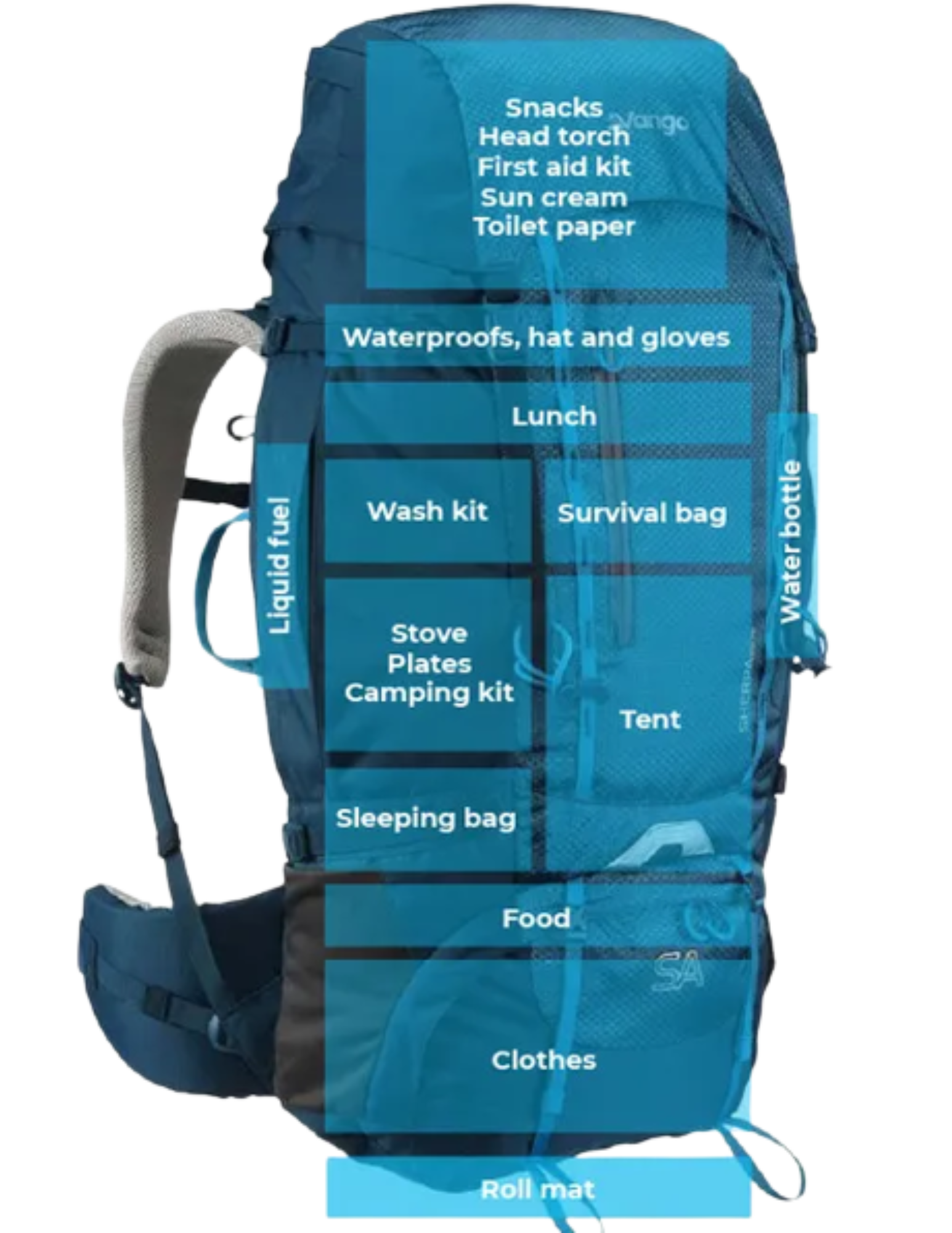 Tip: Aim for a pack weight ≤ 25% of body weight (often 10–12 kg for most participants once water is on board).