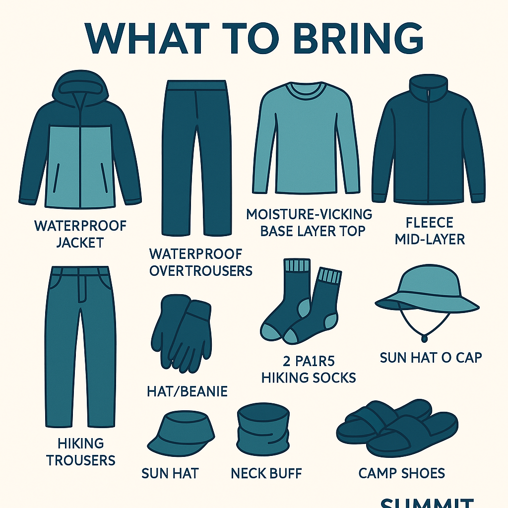 Waterproofs: Breathable jacket with hood + waterproof over-trousers.